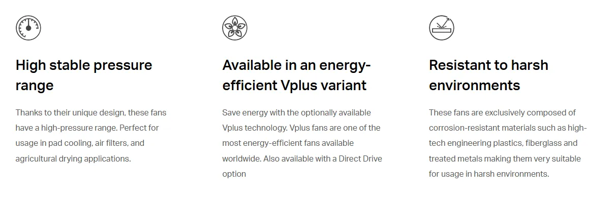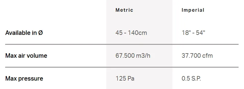 Since February 2024, the 54-inch AireGard Fiberglass Cone Fan has also been available in a Direct Drive version. This model integrates innovative Vplus Technology, delivering maximum energy savings while simplifying maintenance, ensuring reliable long-term operation.