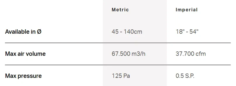 Since February 2024, the 54-inch AireGard Fiberglass Cone Fan has also been available in a Direct Drive version. This model integrates innovative Vplus Technology, delivering maximum energy savings while simplifying maintenance, ensuring reliable long-term operation.