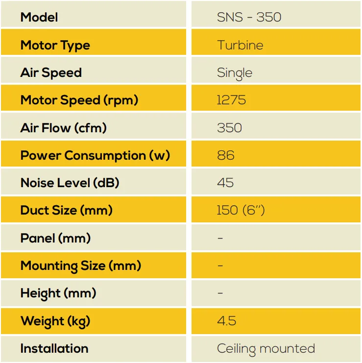 The AireGard SNS-350 Inline Series is a high-performance extractor fan with an ultra-quiet turbine motor, designed for ducted ventilation. Delivering 350 CFM airflow with low noise at 45 dB, it is ideal for both residential and commercial applications.