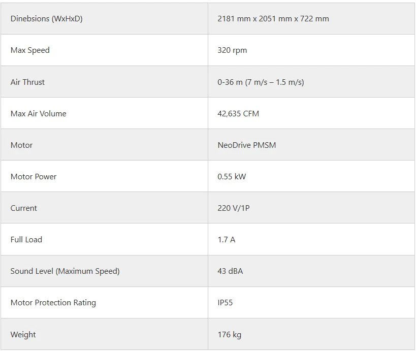 With an IP55 waterproof rating, this fan is suitable even on rainy days and is simple to clean. It also features VFD stepless speed control for smooth and precise adjustment. Built with high-strength materials, a fluorocarbon paint finish, and efficient heat transmission design, the F-75 offers a service life of up to 15 years.