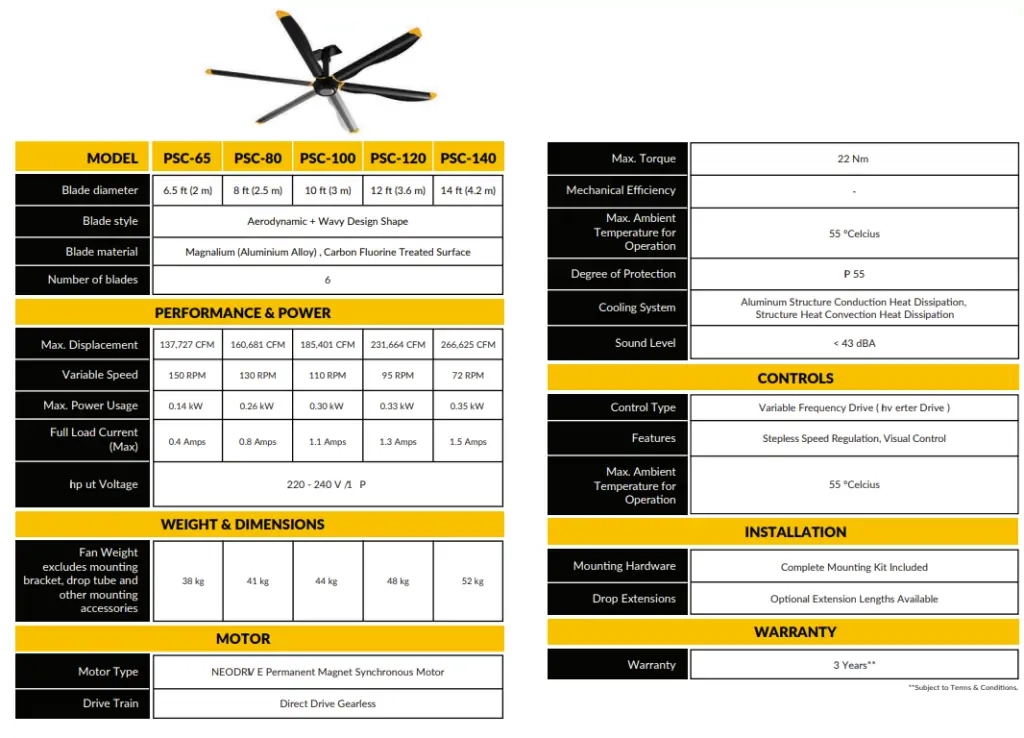 - The PSC Series delivers dense air volume & thermal comfort to its surrounding in 3-dimensional circulation. A single fan easily exceed 250.