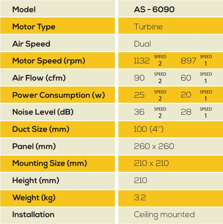 The AireGard AS-6090 Silent Series features a dual-speed function for flexible airflow and efficient performance. Its durable metal housing ensures reliable operation, while the silent design makes it ideal for residential and commercial spaces needing quiet yet powerful ventilation.