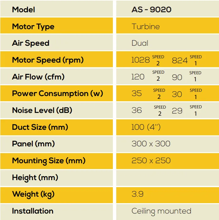 The AireGard AS-9020 Silent Series features a dual-speed function for flexible airflow and efficient performance. Its durable metal housing ensures reliable operation, while the silent design makes it ideal for residential and commercial spaces needing quiet yet powerful ventilation.