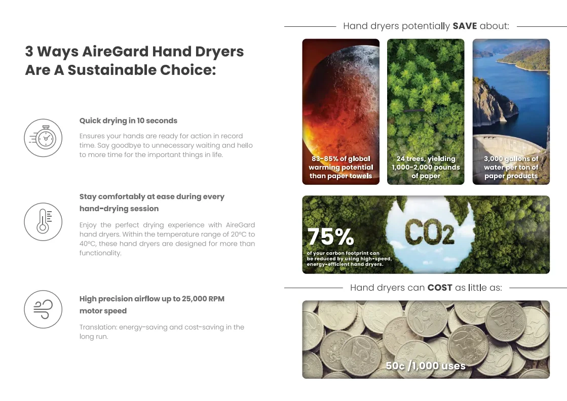 AireGard offers a wide range of Washroom Hand Dryers designed to meet different business needs. With our solutions, you can keep your washroom hygienic and efficient while focusing on running your business.