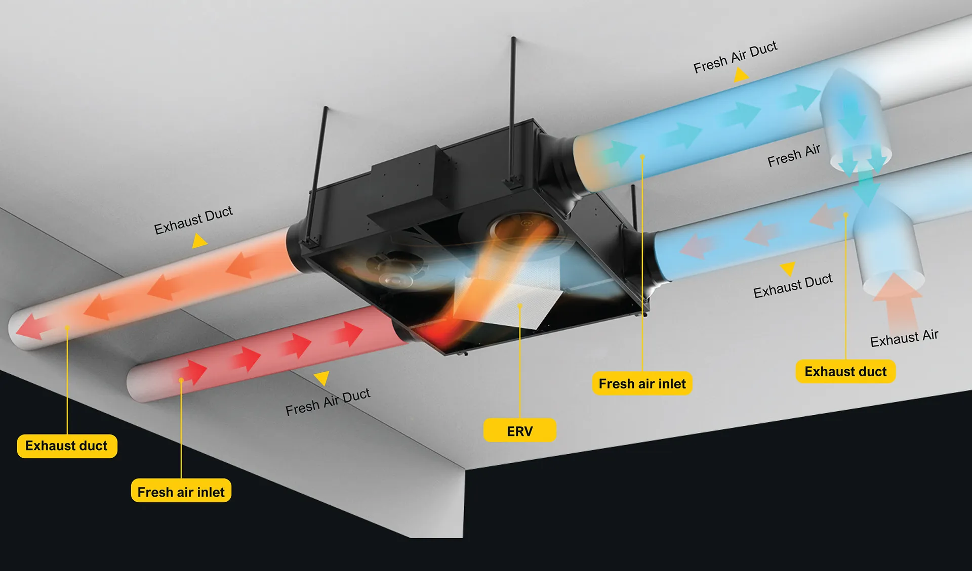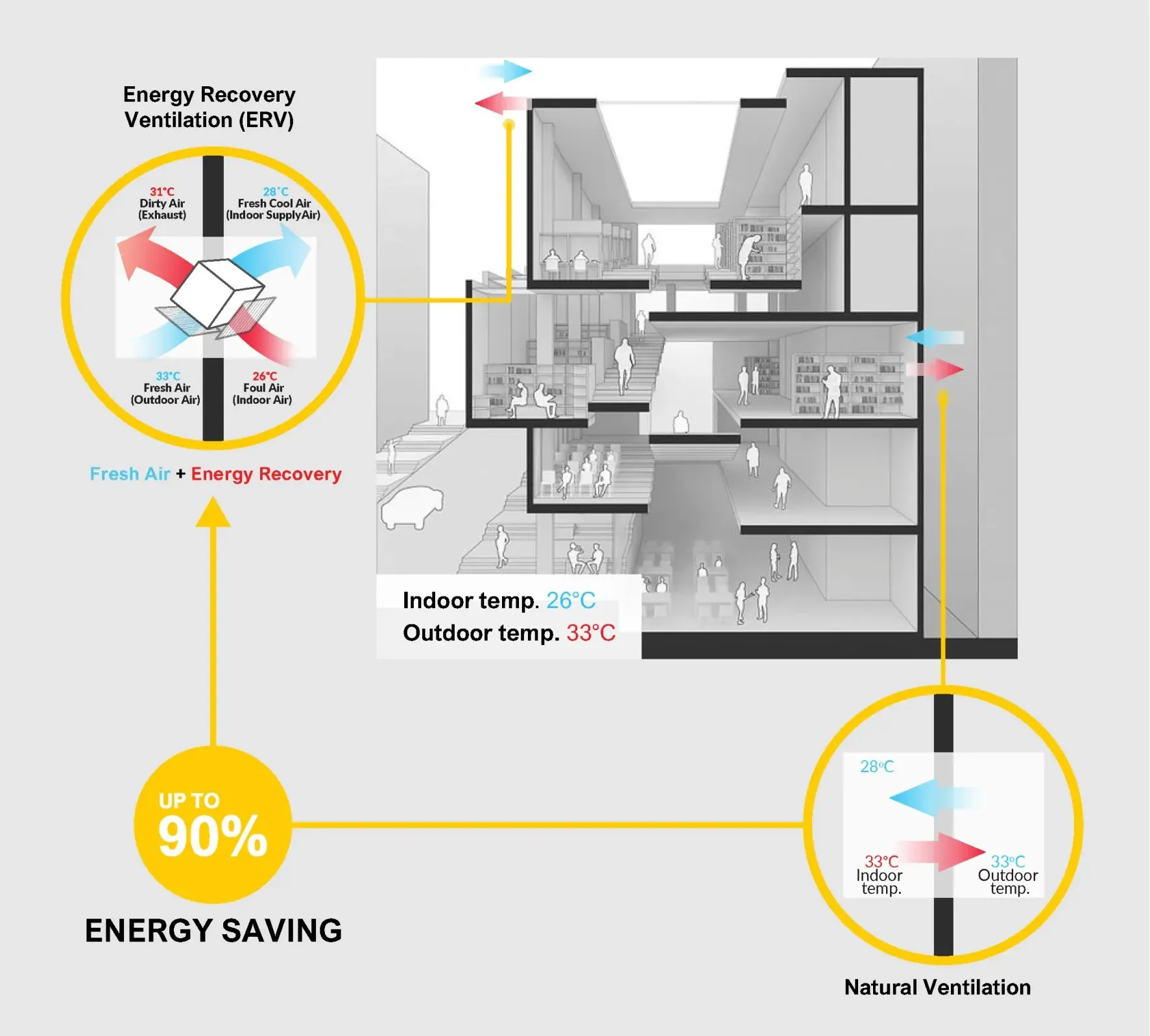 It provides a fresh supply of air with minimal loss of cool air indoors because of its energy recovering core. The outdoor air that carries heat will go through the ERV and enter the enclosed space as fresh air with a maintained temperature. When the colder indoor air exits through the ERV, up to 90% of the cold energy can be recovered and used to cool the hot outdoor air that is supplied into the enclosed space, without exerting excessive load onto the air-conditioning system.
