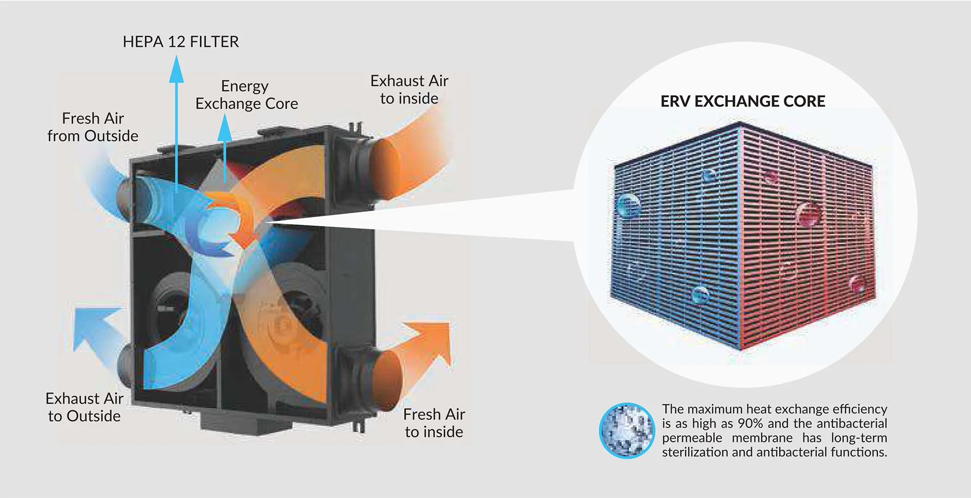 When an ERV introduces fresh air with a maintained temperature and humidity into an enclosed space, it dilutes the concentration of virus particles in the air with a filter that removes stale air during air change.