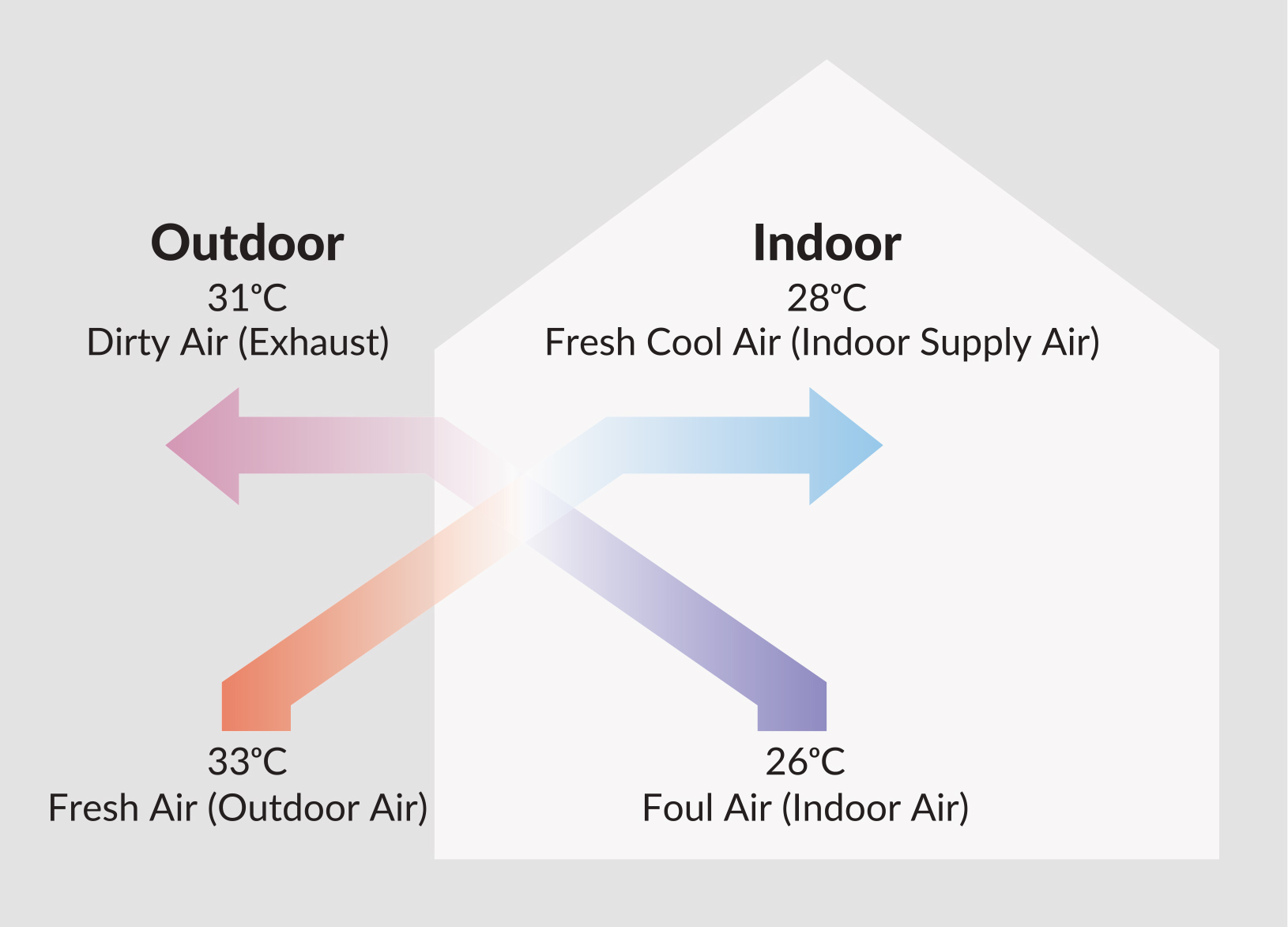 When the air-conditioning is turned on, the energy of the cold air discharged from the room is used to pre-cool the hot air outside and then sent to the room, hence, an efficient energy recovery concept.