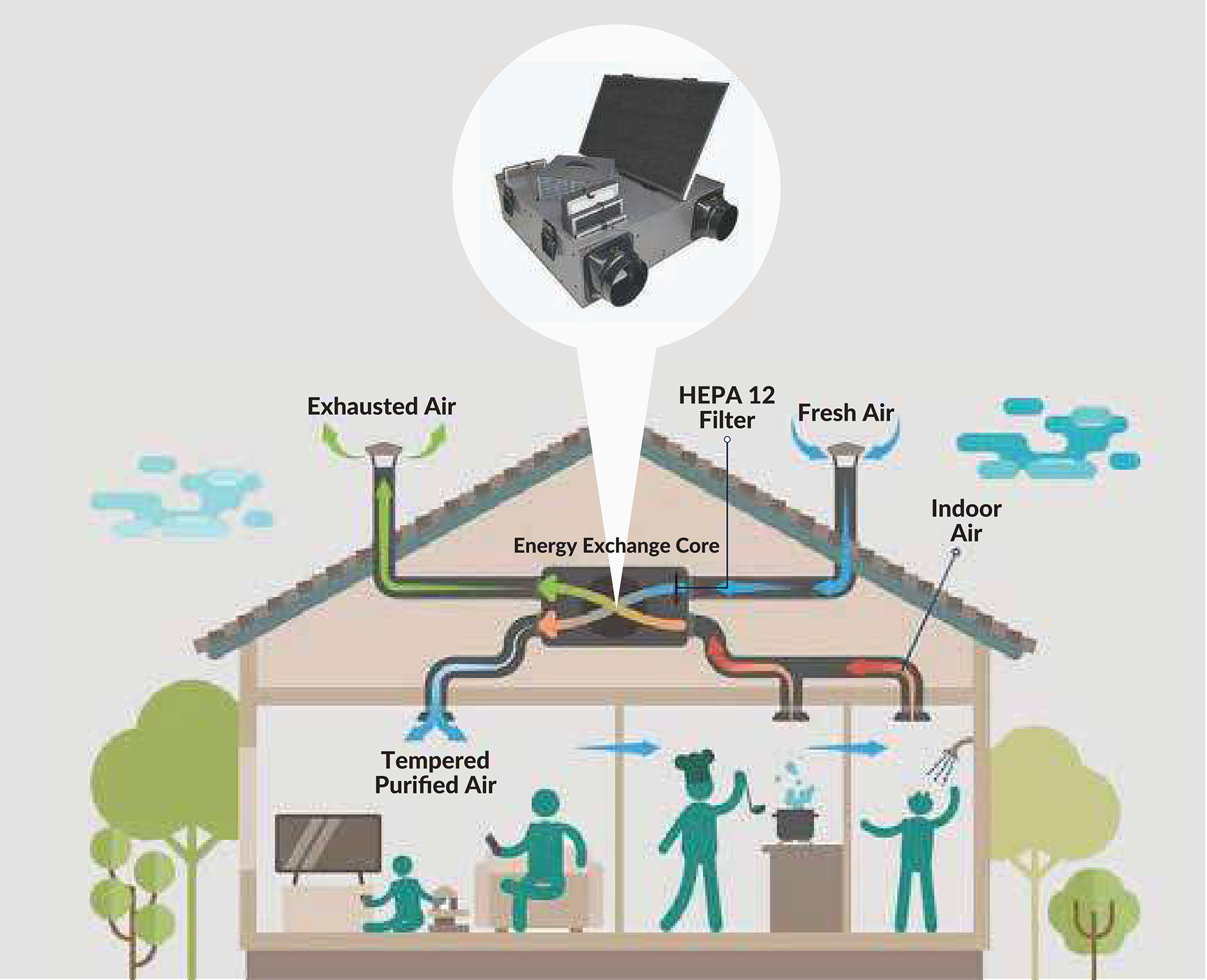 When an ERV introduces fresh air with a maintained temperature and humidity into an enclosed space, it dilutes the concentration of virus particles in the air with a filter that removes stale air during air change.