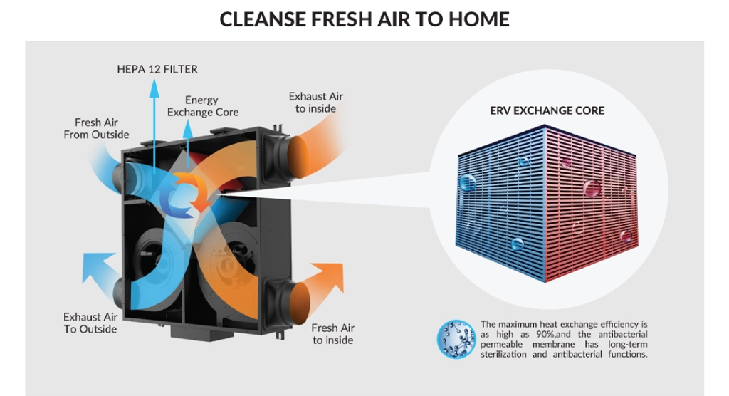 So, how does an ERV work? It’s simple; an ERV allows people to keep the windows closed and the air-conditioning on without worrying about the indoor air quality because it will keep the air fresh by supplying outside air while exhausting the stale indoor air.